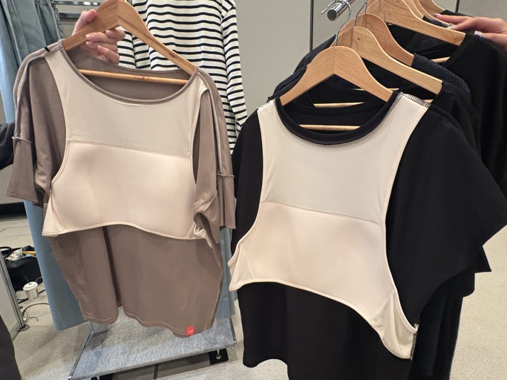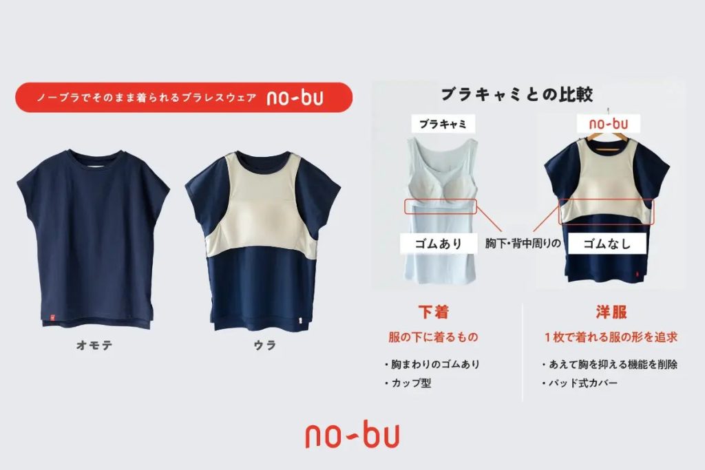 no-buのブラレスウェアはカップではなく胸が当たる前面に表移りをしない生地をつけることでブラやキャミなどのインナーを着なくても1枚で着られるウェア。
