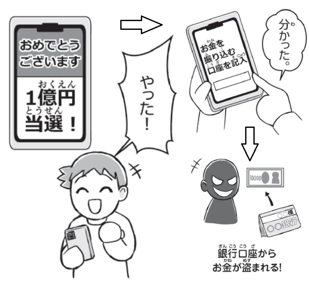 「高額当選しました!」や「〇〇万円差し上げます」といった内容のメールに返信すると「振り込むために手数料を支払ってください」などと指示され、お金をだまし取られるというパターンや、「クレジットカードや銀行口座を登録してください」と指示されて登録すると、クレジットカードを勝手に使用されたり、銀行口座からお金が引き出されたりする危険もあります。