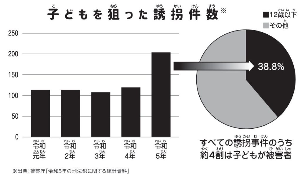 さて、下のグラフは子どもを狙った誘拐件数です。令和5年に起きた誘拐事件のうち、12歳以下の子どもが被害者となった割合は38.8%。19歳以下まで広げると、なんと89.2%に上ります。大人と比べて子どもは体が小さく、力も弱いため、無理やり連れ去る誘拐の標的になりやすいのです。