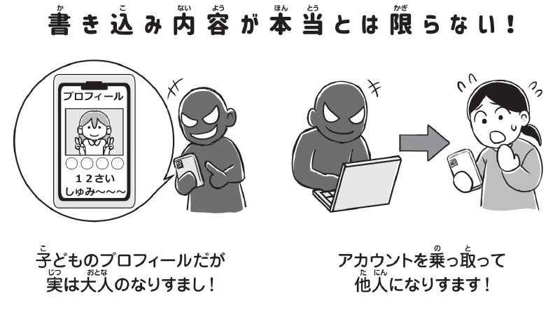 インターネットは便利な反面、誰でも簡単にアクセスできるので、投稿した写真や動画は仲のいい友だちだけでなく、犯人にも見られるおそれがあります。そのため、個人情報がわかる写真や動画を投稿してしまうと、子どもの顔や生活している地域を知られ、その情報を頼りに待ちぶせされたり連れ去られたりしてしまうかもしれません。