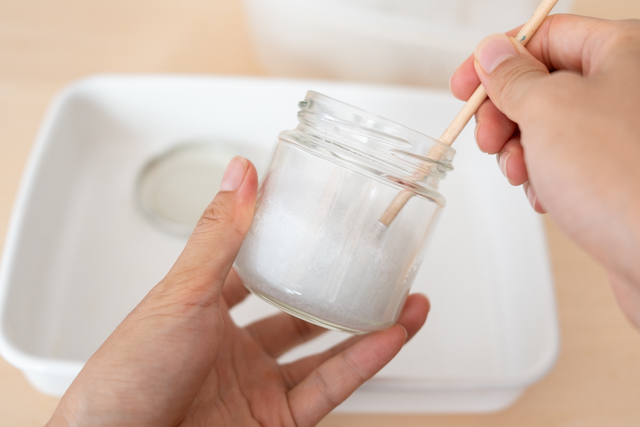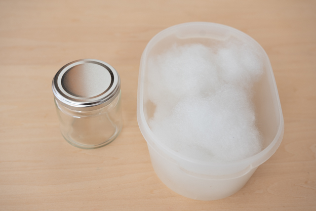 まず、ビンのサイズにちょうど良い量の綿を用意します。今回私が使用したのは200ml弱のビンだったため、4g×2=8gの綿を用意しました。