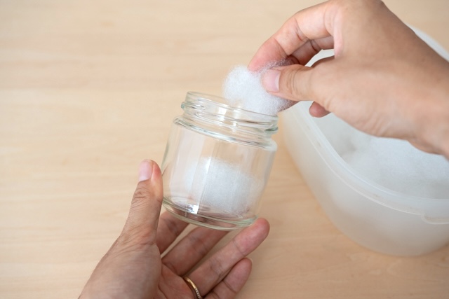 2. 綿は、小さくちぎって、少しずつ入れるのがコツ。指先で丸めるようにして、ビンの底から詰めていきましょう。