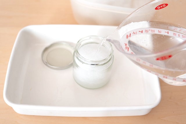 3. ビンの半分まで綿が入ったら、ひたひたになるまで水を注ぎます。