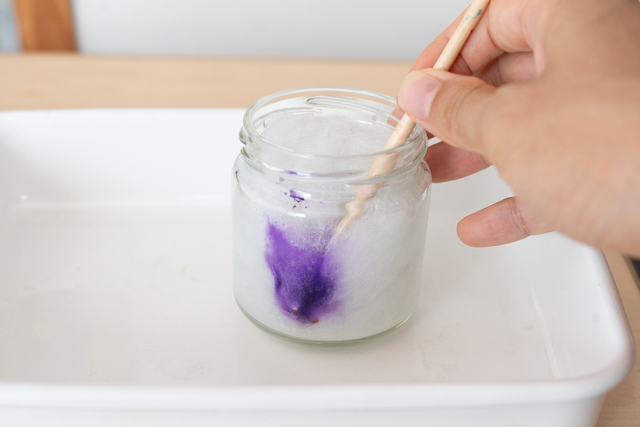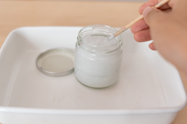 7. 筆の先に、少しだけ絵の具をつけて、ビンのガラスに沿って沈めます。すると、綿と水に色がつきます。
