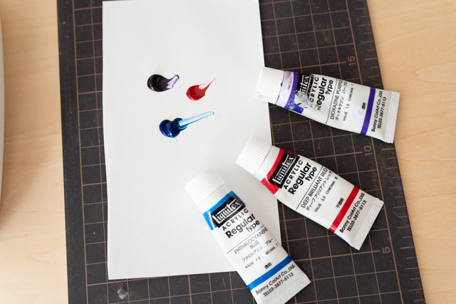 今回は紫・青をメインのカラーに、赤をアクセントのカラーに使うことにしました。色を選んだら、絵の具をほんの少しパレットに出しましょう。