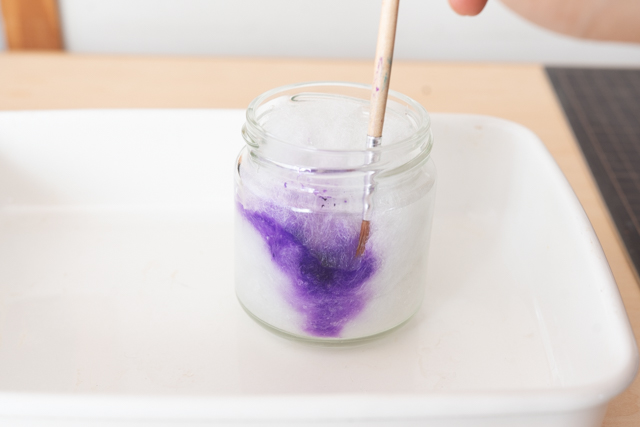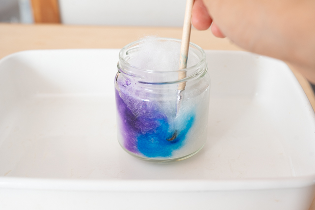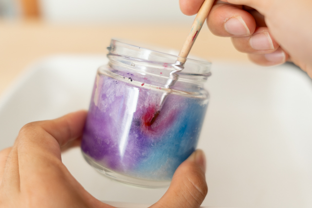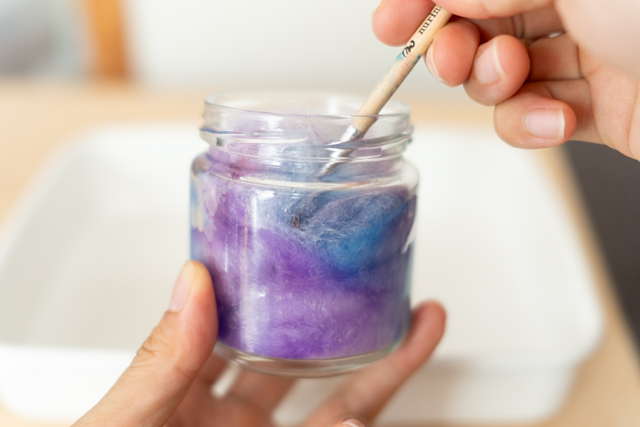 12.全体に色をつけることができたら、筆を綿とビンのガラスの間に差し入れ、綿をずらしてみます。綿の繊維と色が動き、宇宙の星雲のような複雑な動きが生まれます。ビンを一周させながら、少しずつ綿をずらしてみましょう。