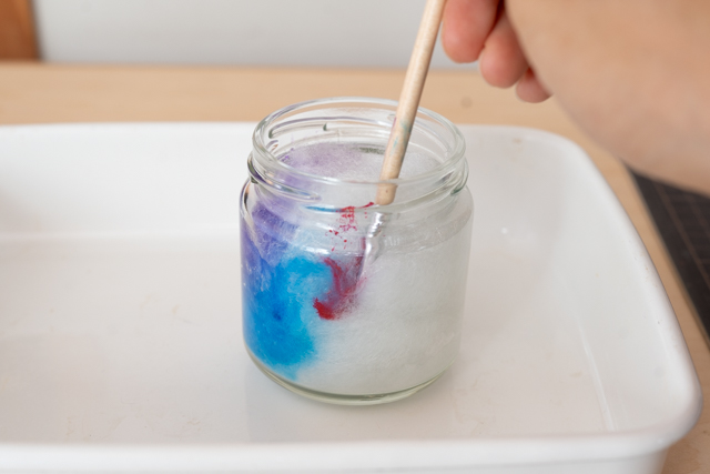 6. ビンの首の下まで綿と水が入ったら、いよいよ色付けです! 色の数が多いとビンの中が濁りやすいため、選んだ宇宙の写真をヒントに、メインカラーの絵の具を2色・アクセントカラーの絵の具を1色選びます。