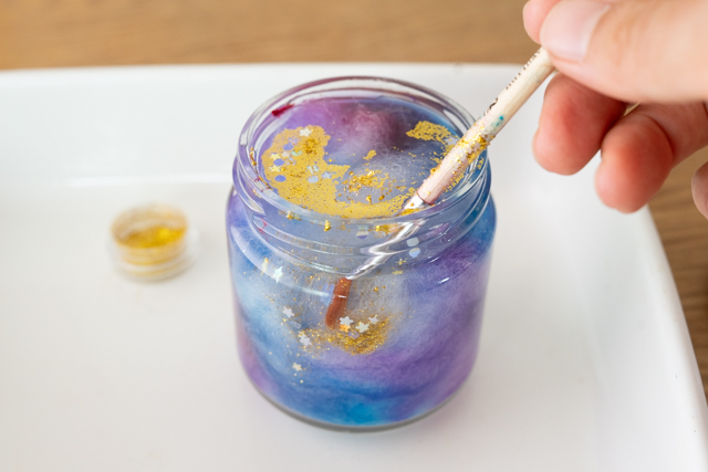14. 全体にラメやスパンコールが行き渡ったら、ふたを閉めます。ビンの中に美しい宇宙ができあがりました!