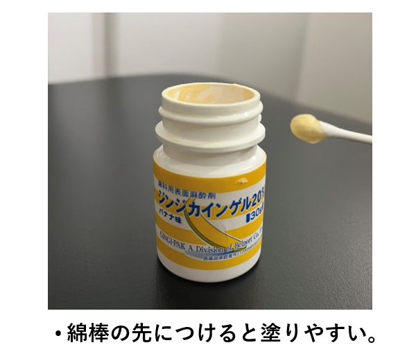 先述のように、針を刺す口の中の粘膜表面を麻酔し、痛みを感じにくくさせます。