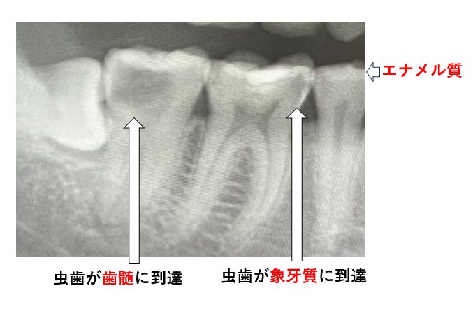 エナメル質を越えて象牙質に達するような深い虫歯や、歯髄組織に達するような痛みを伴う虫歯の治療には麻酔が必要です(図2)。
