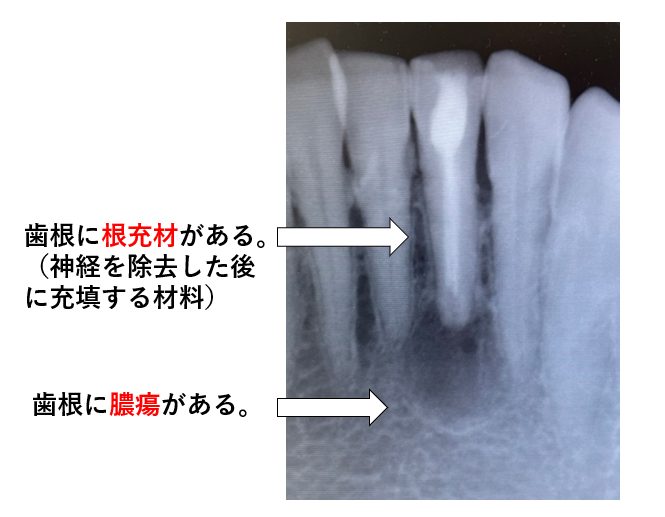 過去の虫歯治療で神経をすでに取り除いている場合は削っても痛みを感じないため、麻酔は不要です。また、虫歯が進行して神経が腐敗して死んでいる場合も痛みを感じないため、麻酔は必要ありません(図1)。