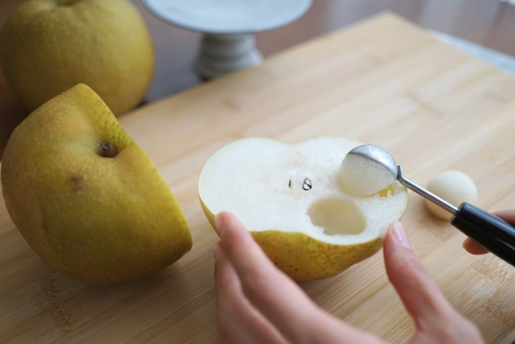 5. 残りの梨も同様に使いつつ、全部で10個をくり抜きます!