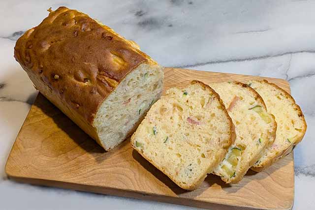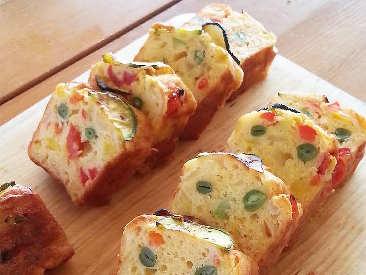 シンプルな材料で作れる、王道のケーク・サレです。ズッキーニやベーコン、玉ねぎを加えることで、野菜の甘みと塩気がバランスよく仕上がります。