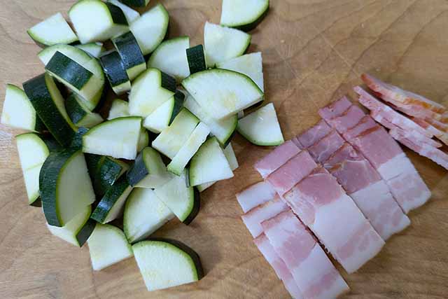 【1】ズッキーニとベーコンは1cm角に切ります。