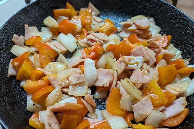 【2】フライパンにオリーブオイルを入れ、玉ねぎとハムを炒めます。しんなりしたらパプリカを加え、塩・こしょうで味を調えます。