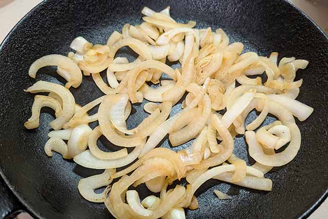 玉ねぎを細切りにして、少量の油(分量外)で炒めます。ベーコンも加えてください。
