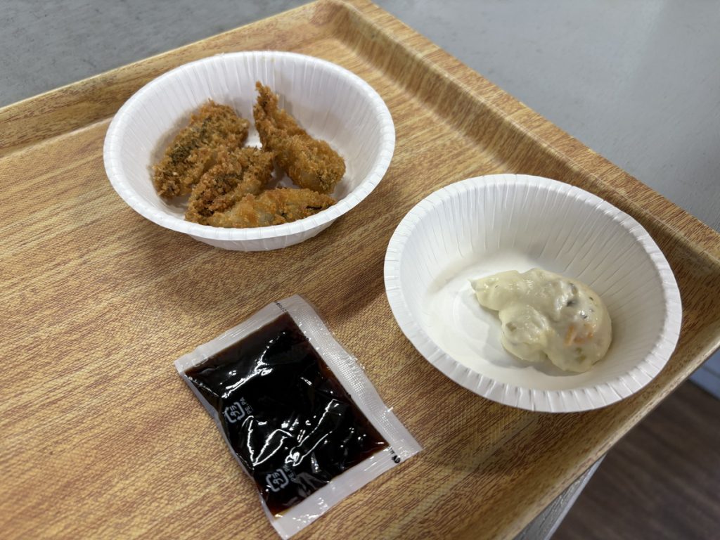 釣った魚はベイマーケットB棟2F「うみファームキッチン」に持ち込むと、その場で調理していただけます。今回釣ったアジは、アジの塩焼きまたはアジのフライが選べました。