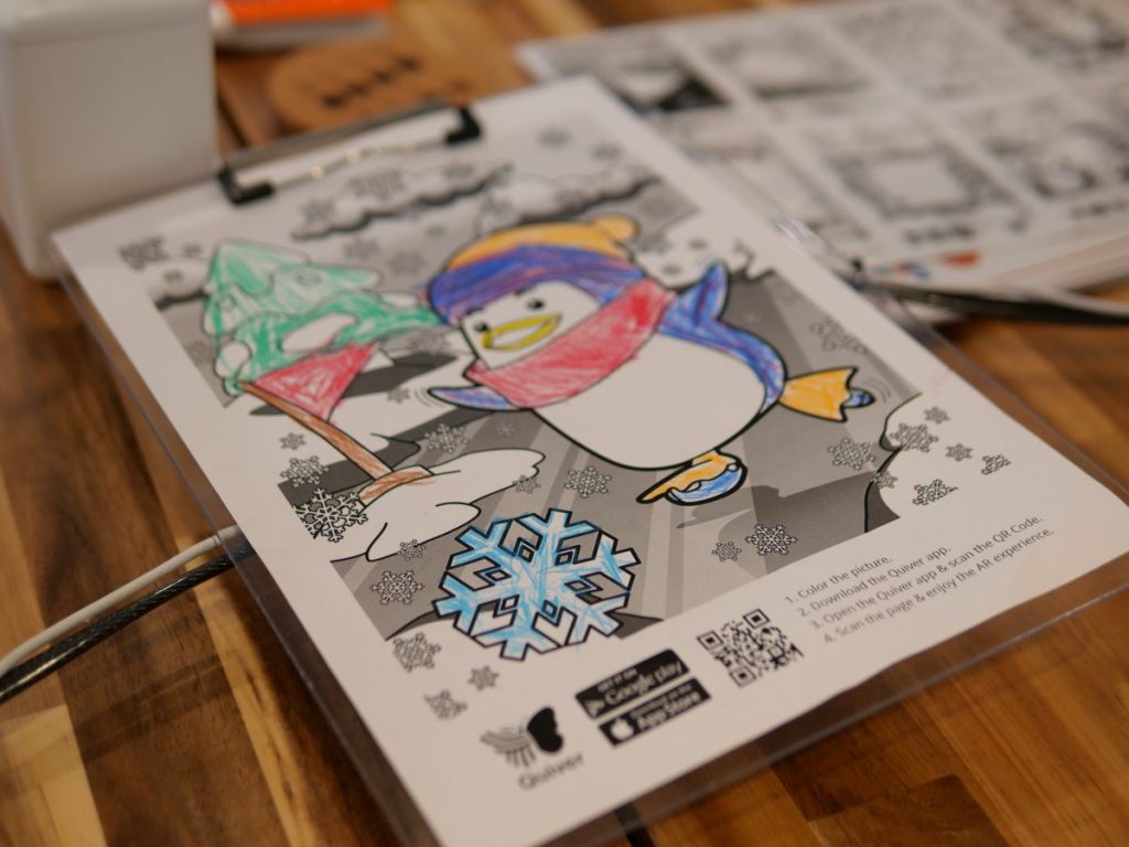 色鉛筆で塗り絵を仕上げて、いざタブレットで読み込み。すると、画面にペンギンが出てきて、ぴょこぴょこ動きだすんです!