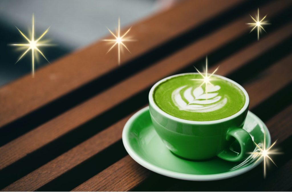 ★アイテム:タブレット端末、ゴールドのアクセサリー、長財布、緑茶、抹茶スイーツ、焼き物の食器、米粉のパン、もち、緑の服、グリーンスムージー