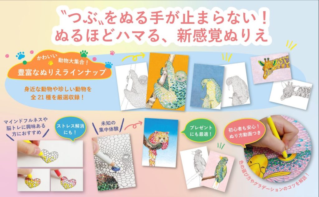 ぬりえはConocaさんの独自技法「つぶつぶアート」が楽しめる工夫がいっぱい。小さな“つぶ”を一つひとつ丁寧にぬり重ねることで、無心になれる癒しの時間を過ごせます。手を動かすうちに日々の雑多なことも忘れてリラックスできる、まるで瞑想のような体験です。
