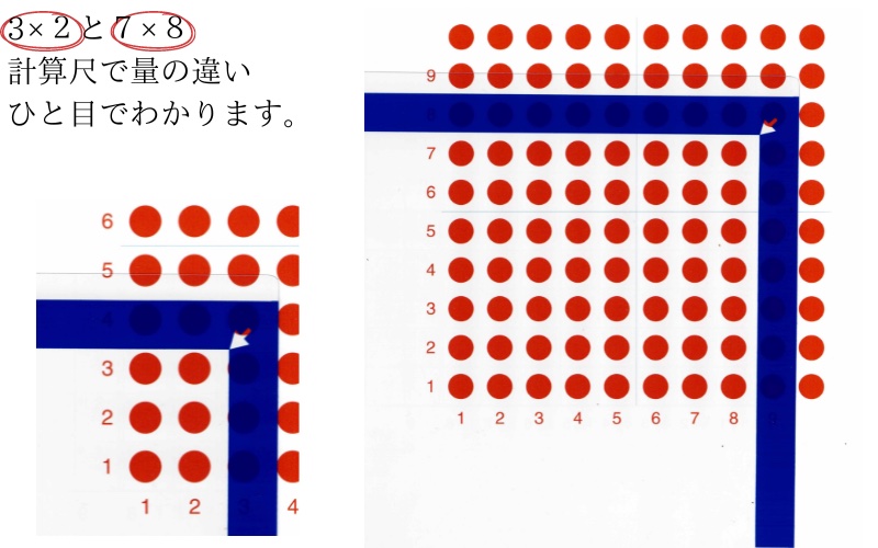 九九表に独自の計算尺をあてると、3×2や7×8を単なる数字の羅列ではなく量感としてイメージできるようになります。