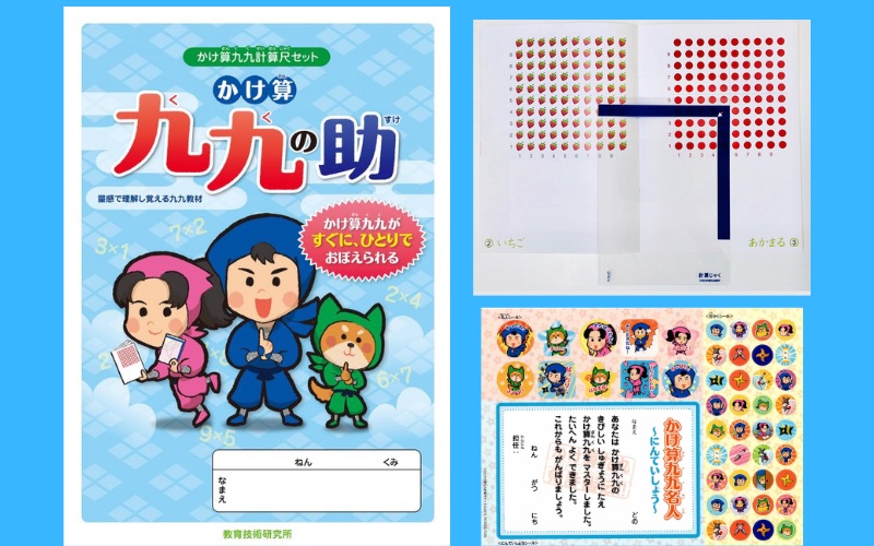 九九の助は、「かけ算九九研究会」の先生たちが考案した教材です。具体物(いちご)から、抽象(丸)、そして数字へと九九表をステップを踏んで覚えることができます。