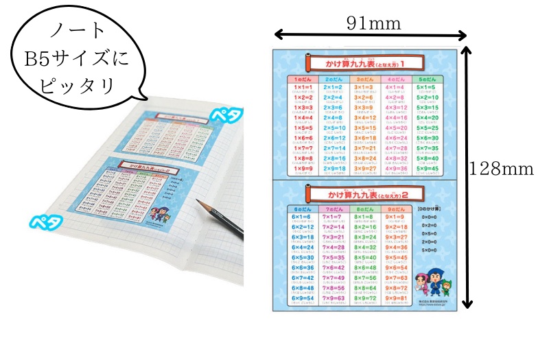 さらにうれしいことに、B5のノートに貼れる九九表シールもセットされています。九九を暗記できなくても、ノートに貼った九九表で確認できます。