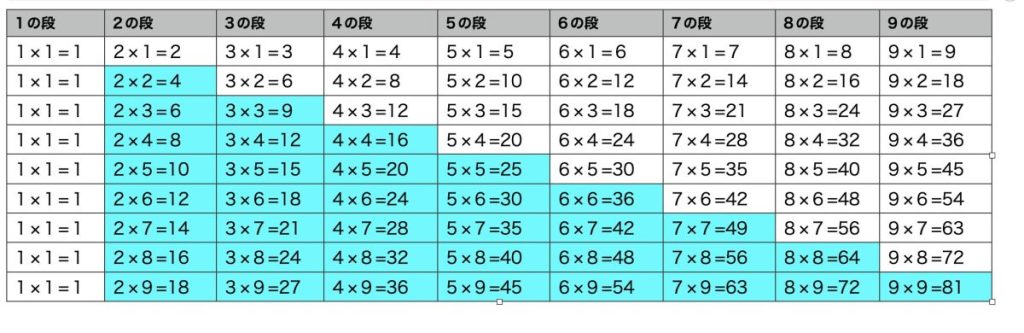 九九表の場所といっても1の段から9の段まで全部覚える必要はありません。半分だけ覚えればいいのです。2×3と3×2の答えは同じですから、どちらかを覚えていればいいわけです。