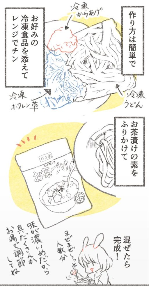 我が家では冷凍ほうれん草とか冷凍からあげとかをポイっと入れています 。そのほかにも冷凍食品でお好みのものがあればぜひ入れてみてください。 お茶漬けとうどんという異色の組み合わせですが、結構合うんです(笑)。