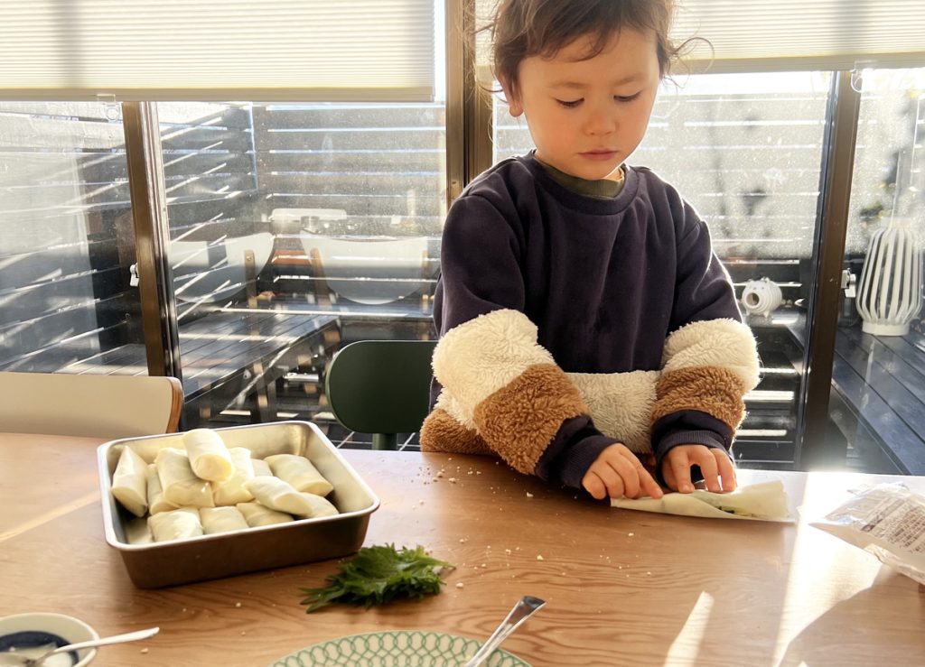 大好きな春巻きは、巻くところも手伝ってくれます。