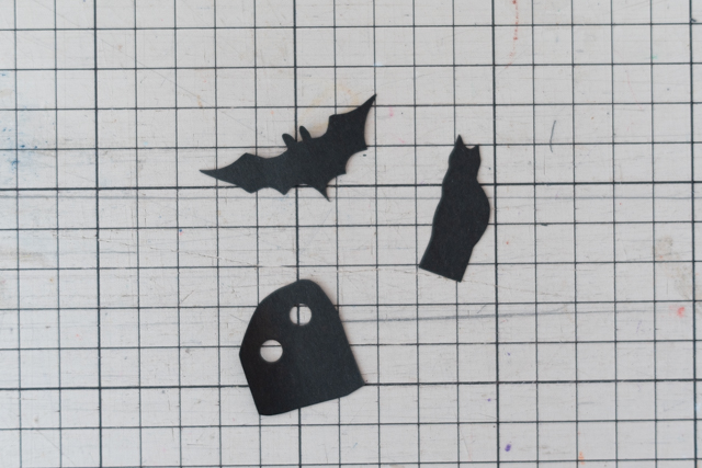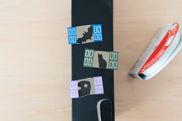 5.  窓の中から、怪しい生き物たちをのぞかせてみましょう。窓の中に入れたい生き物を、色画用紙を切り抜いて作ります。セロハンテープで固定するので、下や横など、テープを貼る部分を少し残しておくと良いでしょう。