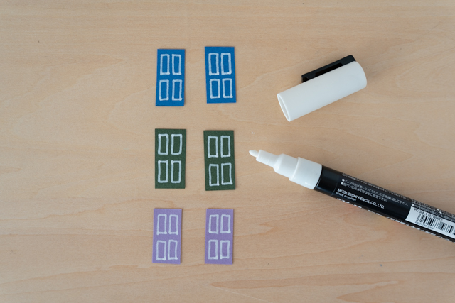 7.  今度は、窓の扉を作ります。色画用紙をカットして、ポスターカラーで扉に模様を描きます。
