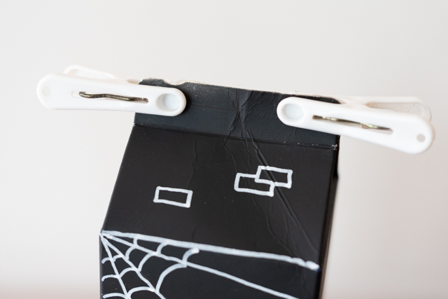 10. 牛乳パックの上部を、接着剤で留めます。しっかりくっつくまで洗濯ばさみなどで固定します。