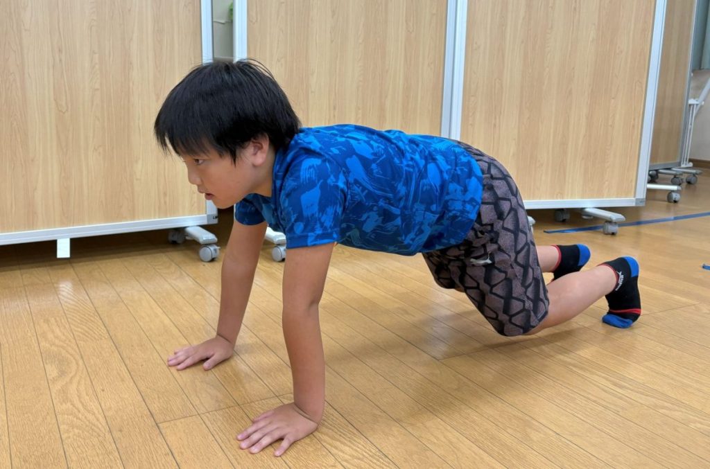 伊藤さん このとき気をつけたいのは、膝をつかないで進むこと。膝をつかないことで体幹や脚の筋力がさらに養われます。3mくらい離れたところに格子を設置し、目印を置いたらまた膝をつかないハイハイで戻ってきます。そして次にまた「ヨーイドン」で始めます。