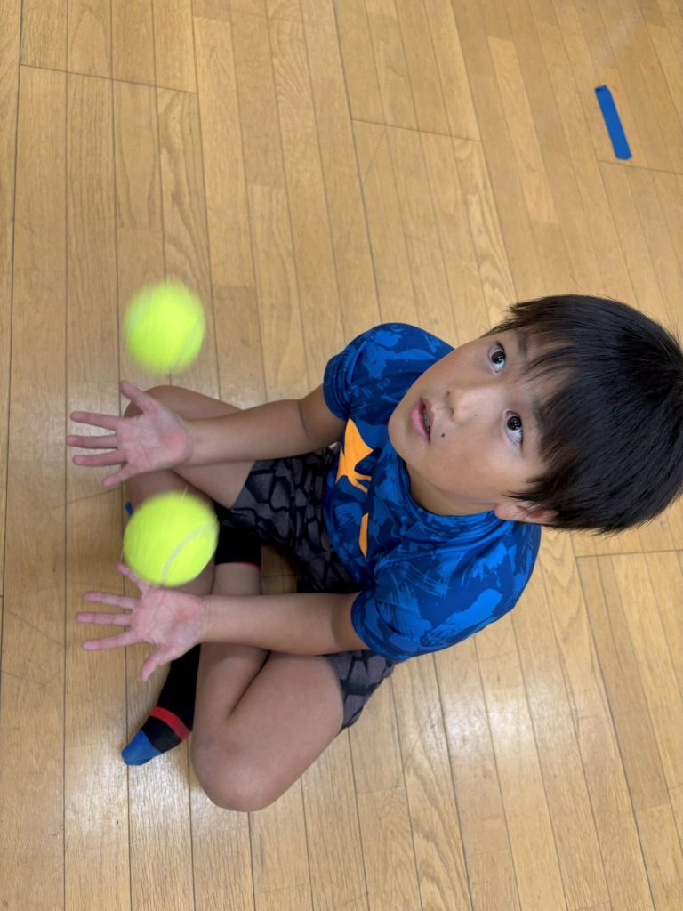 ボールの落下地点に手をおき、受け取ると同時に手でギュッとボールをつかみます。上手になってきたら、ふたつ同時に落としてふたつ受け取る練習もします。10回ずつトライしましょう。