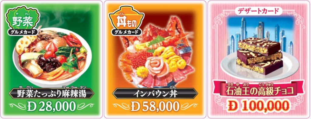 ゴールに到着すると、食後のデザートとして先着順で「デザートカード」がもらえます。まるで”ドバイチョコ”のような「石油王の高級チョコ」や、人生ゲームの自動車ゴマ風の「自動車ゴマ型グミ」など5種類のデザートカードがあり、最後まで”おいしい”を楽しむ仕掛けが満載です。