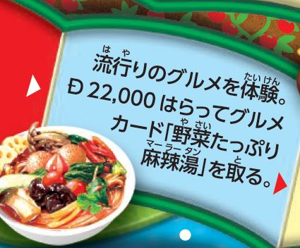 マス目も「流行りのグルメを体験。Ð22,000はらってグルメカード[野菜たっぷり麻辣湯]を取る。」「バイキングのメニュー、片っ端から取りすぎて食べきれない…。Ð5,000はらう」など”おいしい”ものにちなんだ内容になっていて、食欲の秋にぴったりの仕上がりです。