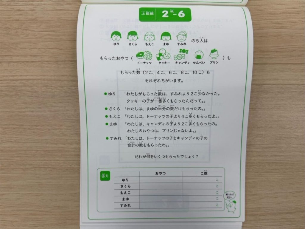 宮本先生:そうなんです。なんとかして、国語が苦手な子にも算数と同じ顔で問題を解かせたいと思ってつくったのが、この文章型パズルです。上級になるにつれて、だんだん文章が長くなる。国語が苦手な子は途中で読むのをやめたくなってしまうんですが、このパズルなら“整理しながら読み進める”練習になるんです。