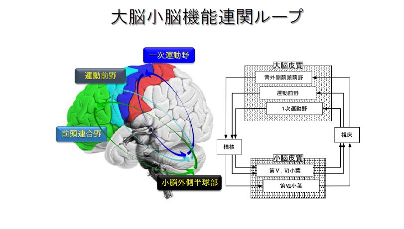 大脳からの指令にうまく対応できなかったとき、小脳が調整して新たな運動プログラムを作り、それを視床を介して大脳皮質に送る。そしてまた大脳からコマンドが来て、という繰り返しを絶えずすると、スマートで無駄のない動きができるんです。