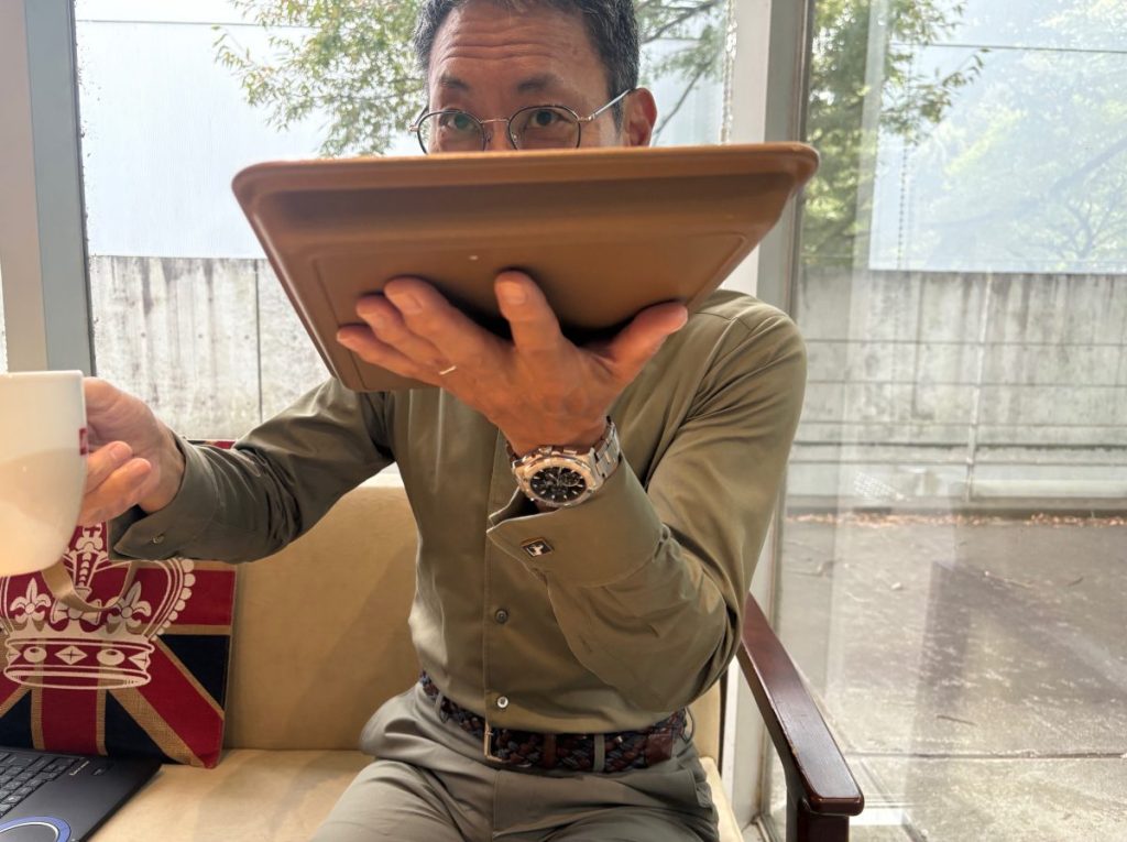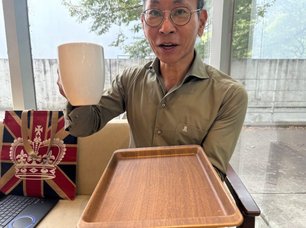 飲み物が入ったマグカップをトレイの上に置き、片手で支えます。