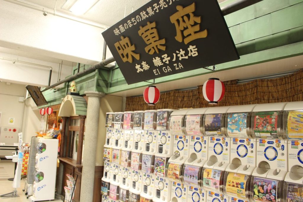 お店の看板は、懐かしいレトロな佇まい。カプセルトイがたくさん並び、どんなものがあるのかとワクワクが止まりません。太秦限定のカプセルトイもあるので、ぜひゲットしてみてください。