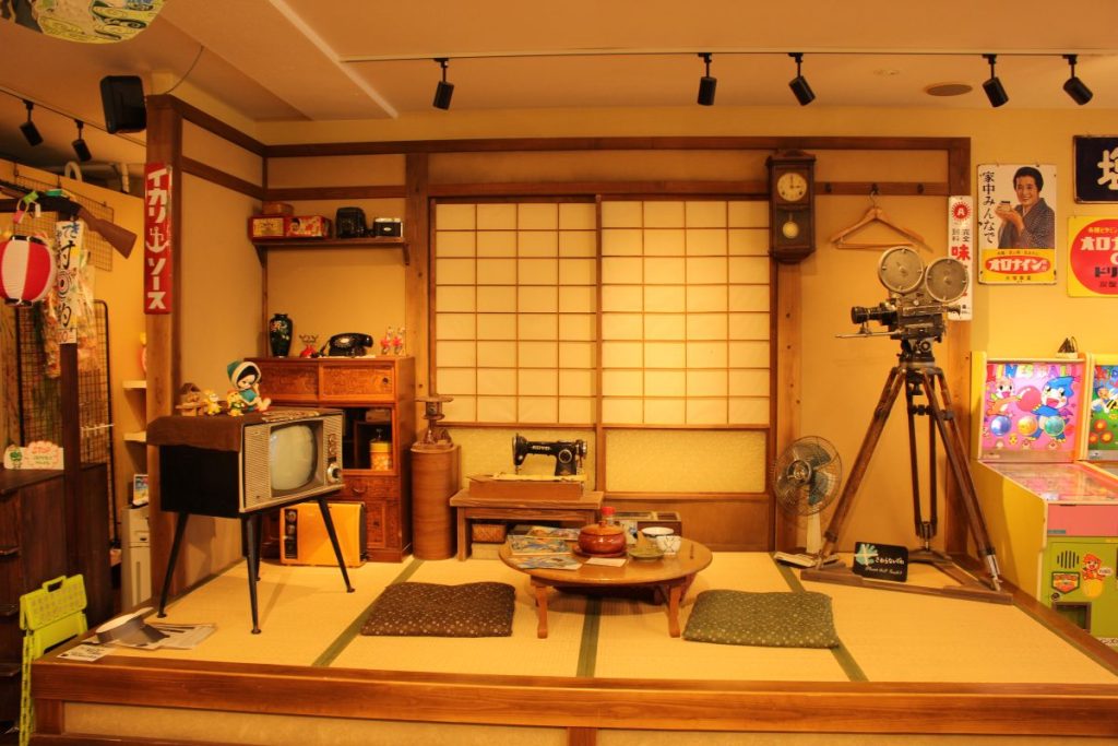 「映菓座」の店内には、映画のセットのような写真コーナーもあります。畳にちゃぶ台、ブラウン管テレビといったレトロな世界。実際に座ってもOKとのことなので、記念写真を撮ってみてください。