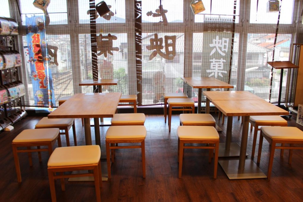 店内奥にあるイートインスペースからは線路と電車が見えますよ