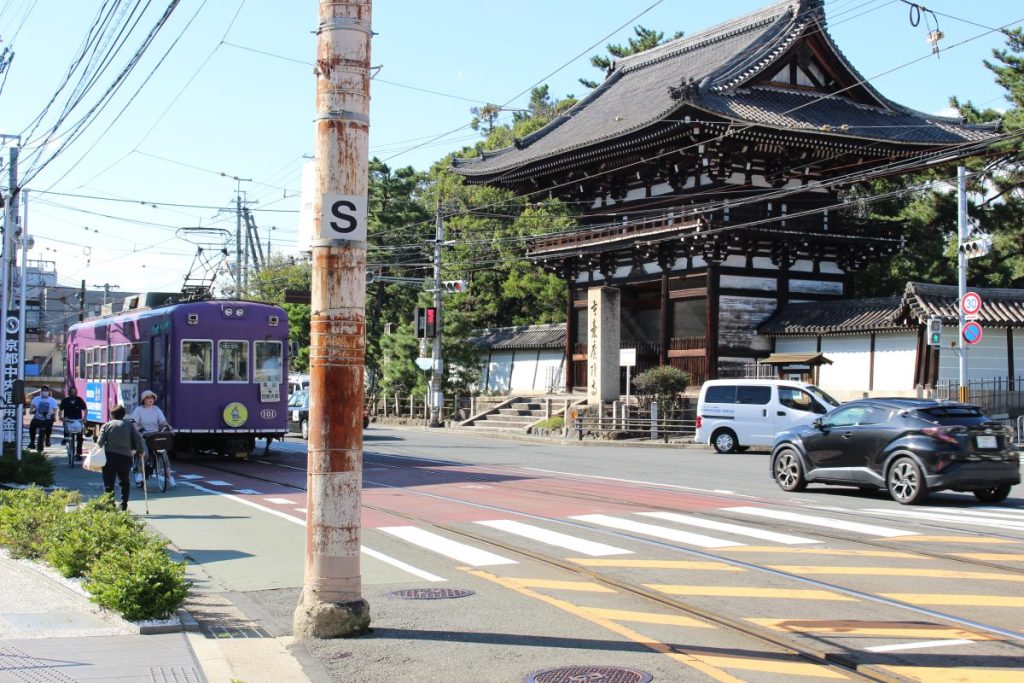 広隆寺・南大門(仁王門)の前を走る嵐電