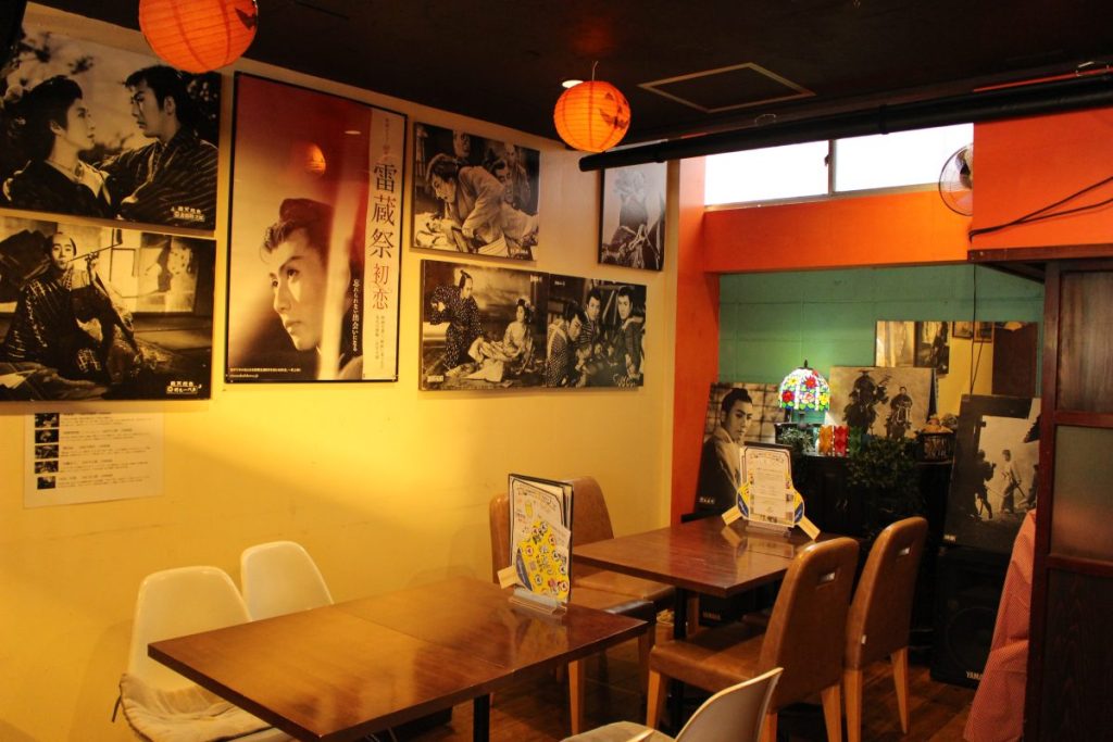大映通り商店街の中ほどにある「キネマ・キッチン」は、美味しい料理やドリンクを楽しみながら、貴重な映画撮影の機材や台本、ポスターなどを見ることができるお店です。