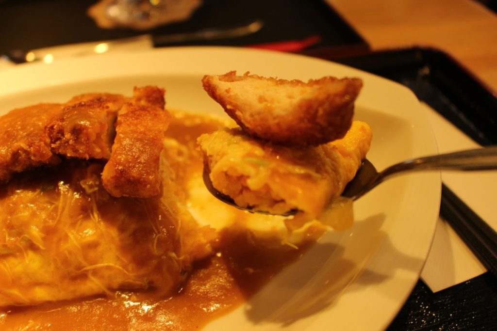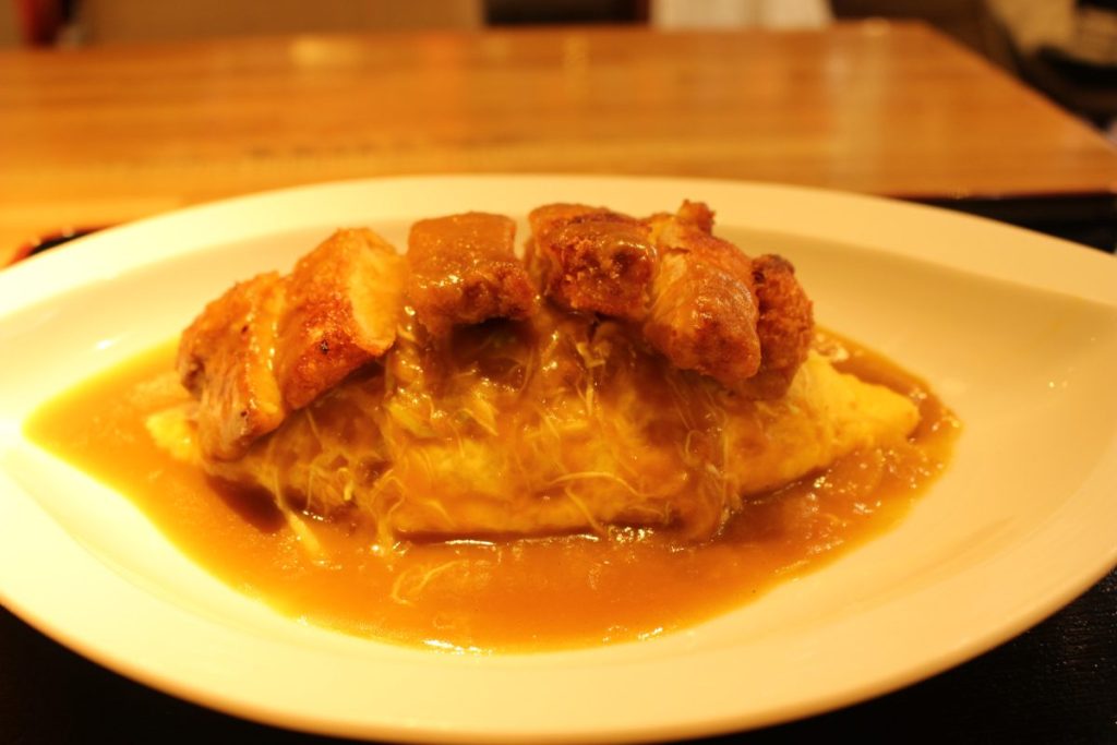 オムライスとサクサクのチキンカツに、和風のカレーソースがとても合います