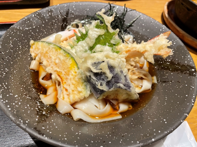 冷たいきしめん(ころきしめん)にエビ天をのせる「天ころ」は、名古屋で人気のメニューです。