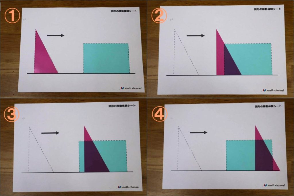 平面図形の問題として出てくる「図形の重なり」は黒板の板書だと2枚の図形がどう重なっているのか分かりにくいことが。そこで100円ショップで手に入る、カラーセロハンで形を再現し、重なりを視覚化。実際に動かしながら形の変化を見ていくとよりわかりやすくなります。