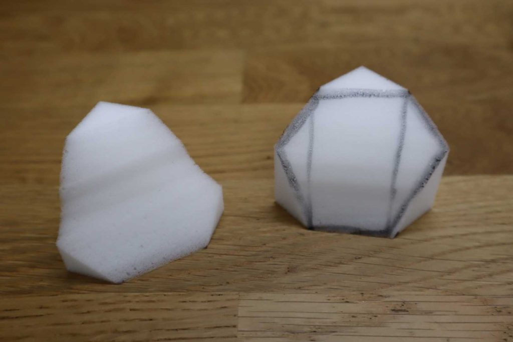 まずは問題に合わせて印をつけてカッターで切ってみる。3つの頂点を通るように切ると断面は正三角形になります。以下のようにある4つの点を通るように斜めに切るとなんと六角形に! そしてこれがちょうど1/2ずつだということもわかります。