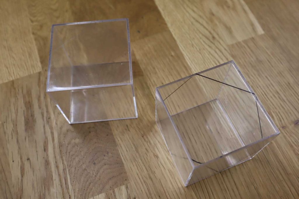 メラミンスポンジで十分学習したあとは、透明なクリアキューブの活用がおすすめ。これに切断面をペンで描くと、メラミンスポンジではわからなかった中の様子がわかり、立体に対する解像度が上がります。水を入れて斜めにし、そのときの水面を見るのもいい勉強になります。